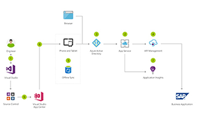 此移動(dòng)工作人員應(yīng)用體系結(jié)構(gòu)采用 Active Directory 來(lái)保護(hù)通過(guò) Azure 應(yīng)用服務(wù) API 管理從 SAP 后端系統(tǒng)傳送到設(shè)備的公司數(shù)據(jù)。