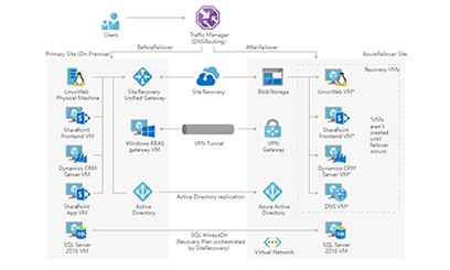 一個(gè)大型企業(yè)架構(gòu),適用于托管在本地?cái)?shù)據(jù)中心且故障轉(zhuǎn)移到 Azure 基礎(chǔ)結(jié)構(gòu)的 SharePoint、Dynamics CRM 和 Linux Web 服務(wù)器。